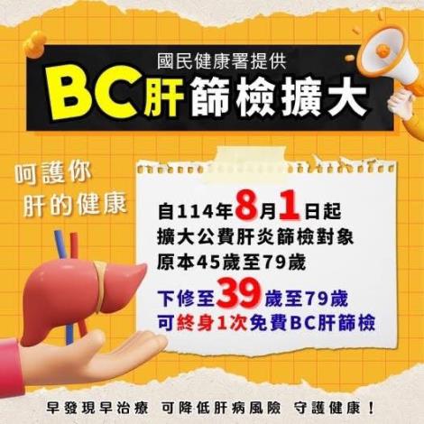 自114年8月1日起調整成人預防保健服務B、C型肝炎篩檢年齡為民國75年(含)以前出生至79歲(原住民提前至40歲)終身一次。